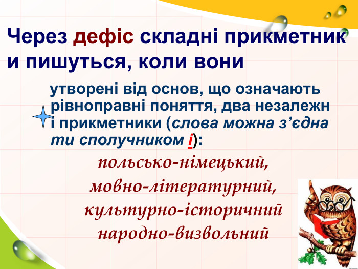 Складні слова, утворені поєднанням незалежних слів (між ними можна вставити сполучник і) пишемо через дефіс. Наприклад: українсько-польський, кімната-музей, вчитель-словесник, мовно-літературний, народно-визвольний.
