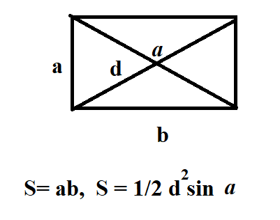 Площа прямокутника дорівнює половині добутку квадрату діагоналі на синус кута між діагоналями.